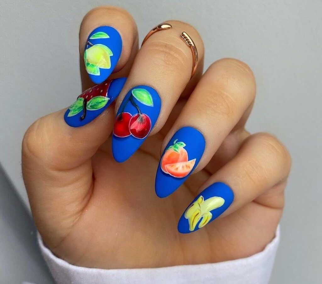 For fruit nail design, the choice of the main color is very important. The bright blue color makes the design full of charm. I think that in design, color is one of the main factors that determine style and visual perception.