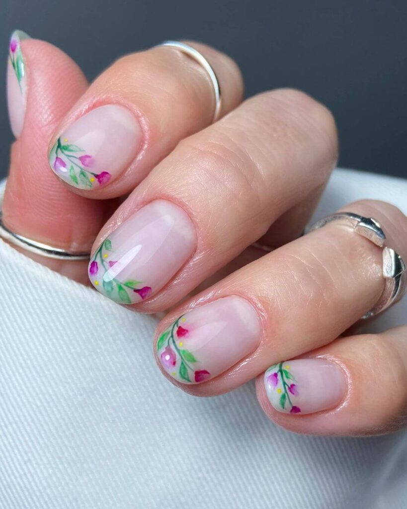 Light green, purple, white and nude colors, look at this perfect floral nail design, these colors are the favorites of women.