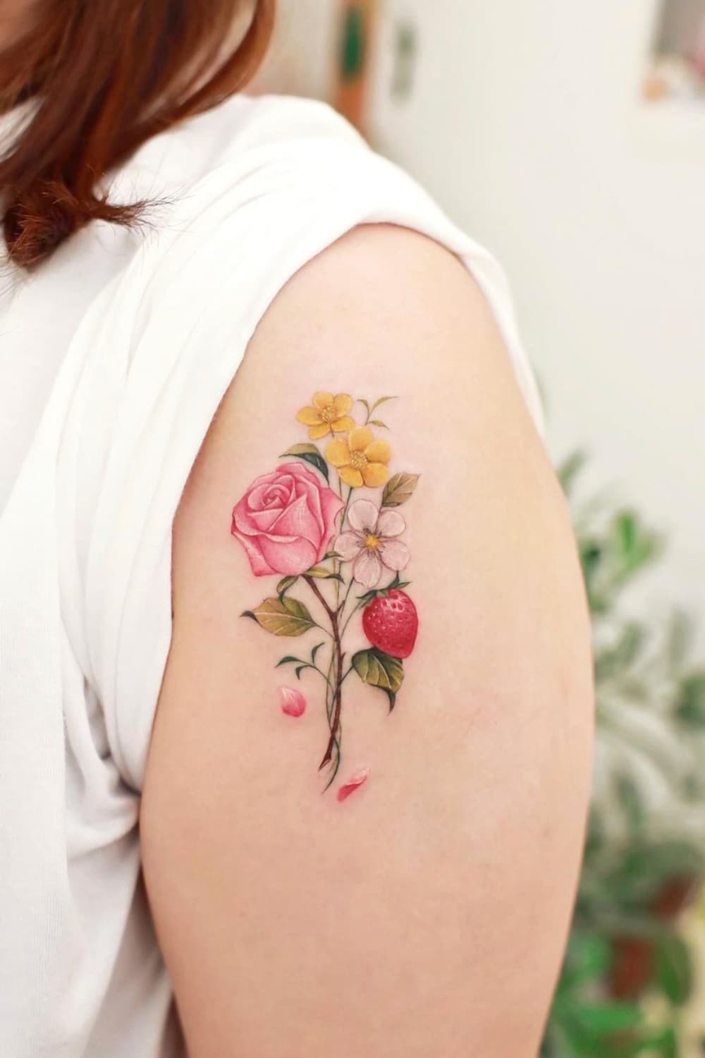 This design symbolizes growth. From flowers to strawberries, this tattoo shows an impressive process.